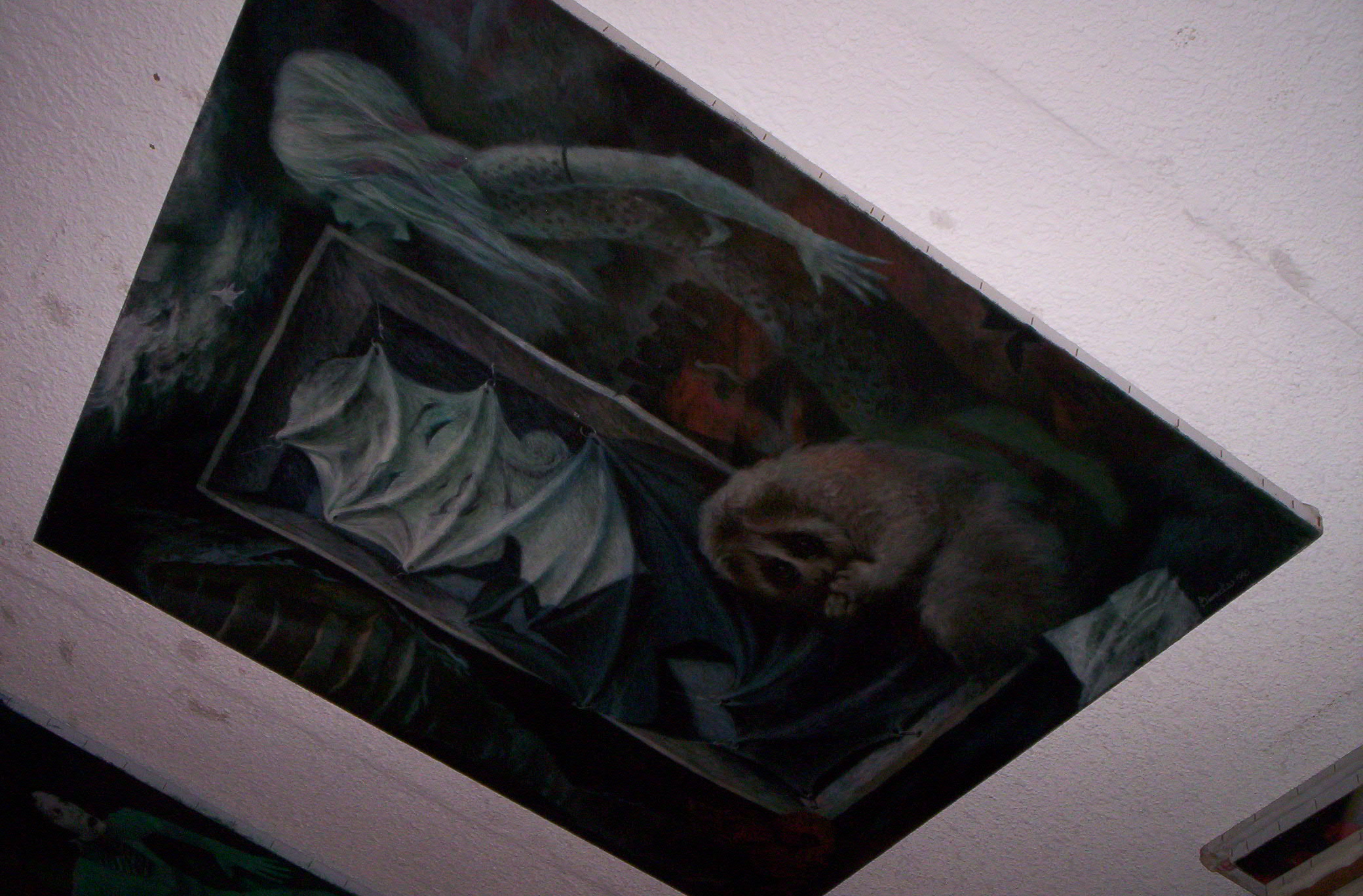 Marilyn’s Smile is one of my favorites and the one that they chose to put on the cover of the local alternative weekly when they did a piece on her. It is such an intense piece that I couldn’t help but wonder what everybody thought about her when they saw it. She had such a wide range of styles and subject matter that to throw this at them without a little explanation almost seemed misleading. Whereas this girl might be playing jacks in another Gianaclis work, this one is in full response mode to the horror that lies before her, what looks like a smiling Marilyn Monroe, who is made up of a waving sheet and stuck by clear as clear nails to the inside of a an old wooden box. Before her is a dark, tattered walkway wrending cavelike up. Below a slothlike creature chewing its nails as though it too is feeling this fear. A letter sits unnoticed in the corner.