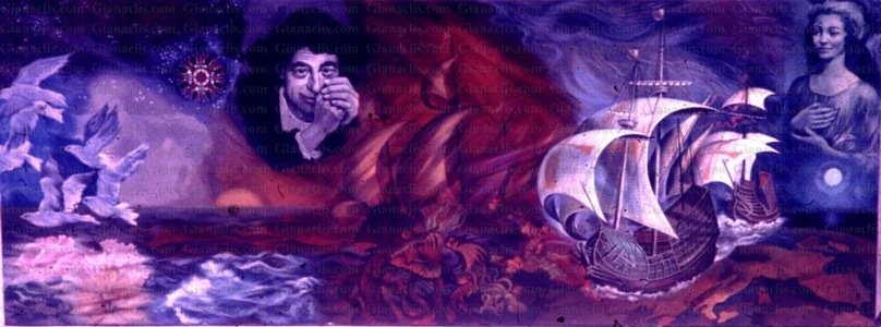 A lost masterwork. This large oil depicts the myth of Christopher Columbus. Integrating her signature mosaic style, she tells the story of the hopes, dreams and fears of the players in an expedition from Spain that altered the course of history forever.